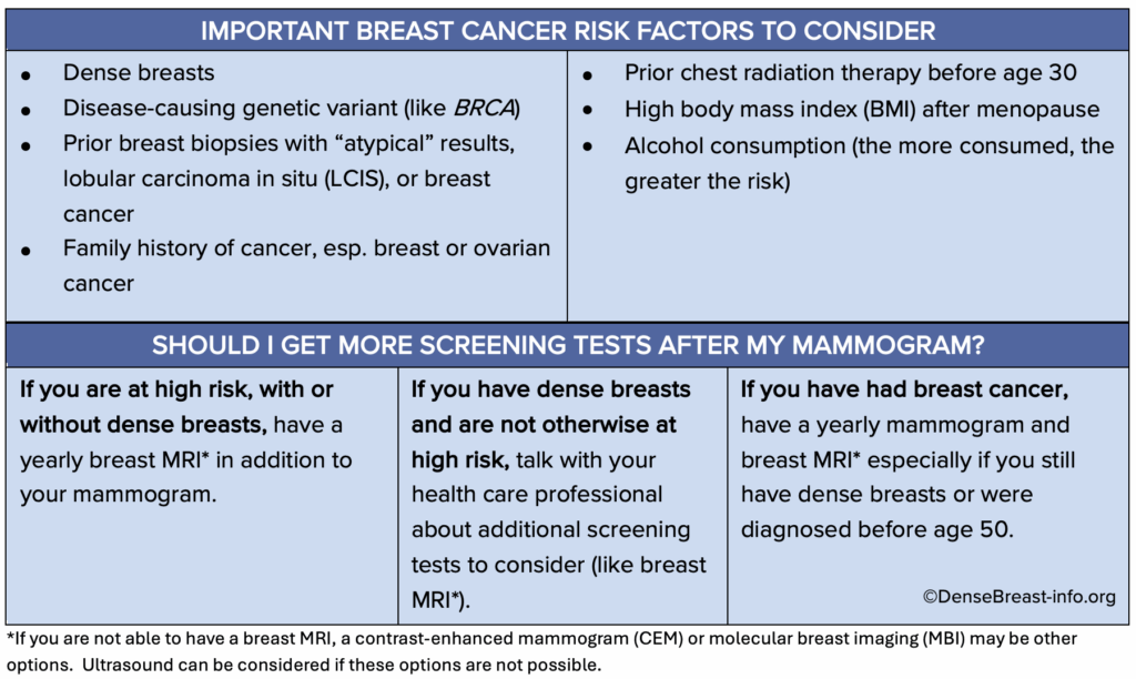 - The type of additional screening tests recommended will depend on your breast density and other risk factors. Talk with your health professional to learn your risk level and what tests may be right for you.